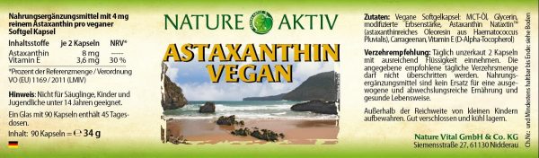Vegane Softgelkapsel: MCT-Öl, Glycerin, modifizierte Erbsenstärke, Astaxanthin Nataxtin™ (astaxanthinreiches Oleoresin aus Haematococcus Pluvialis), Carrageenan, Vitamin E (D-Alpha-Tocopherol)