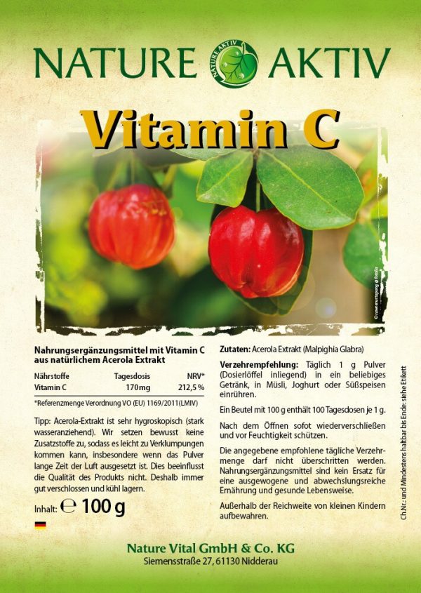 Acerola Kirsche Pulverextrakt mit ausschließlich natürlichem Vitamin C Gehalt. Trennmittel: Maltodextrin