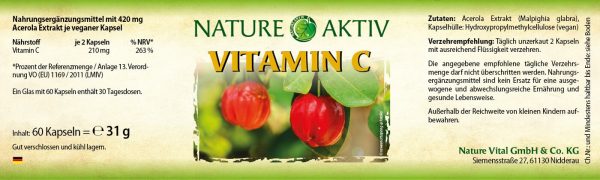 Acerola Kirsche Pulverextrakt mit ausschließlich natürlichem Vitamin C Gehalt. Kapselhülle: Hydroxypropylmethylcellulose (vegan)